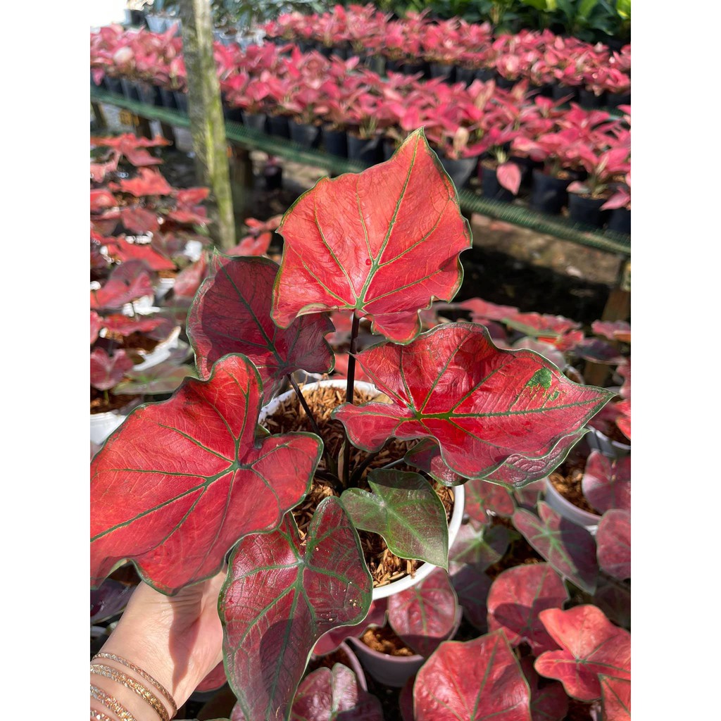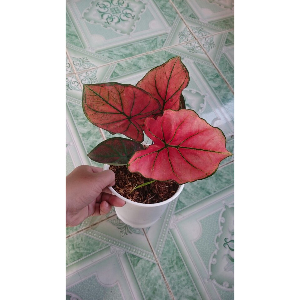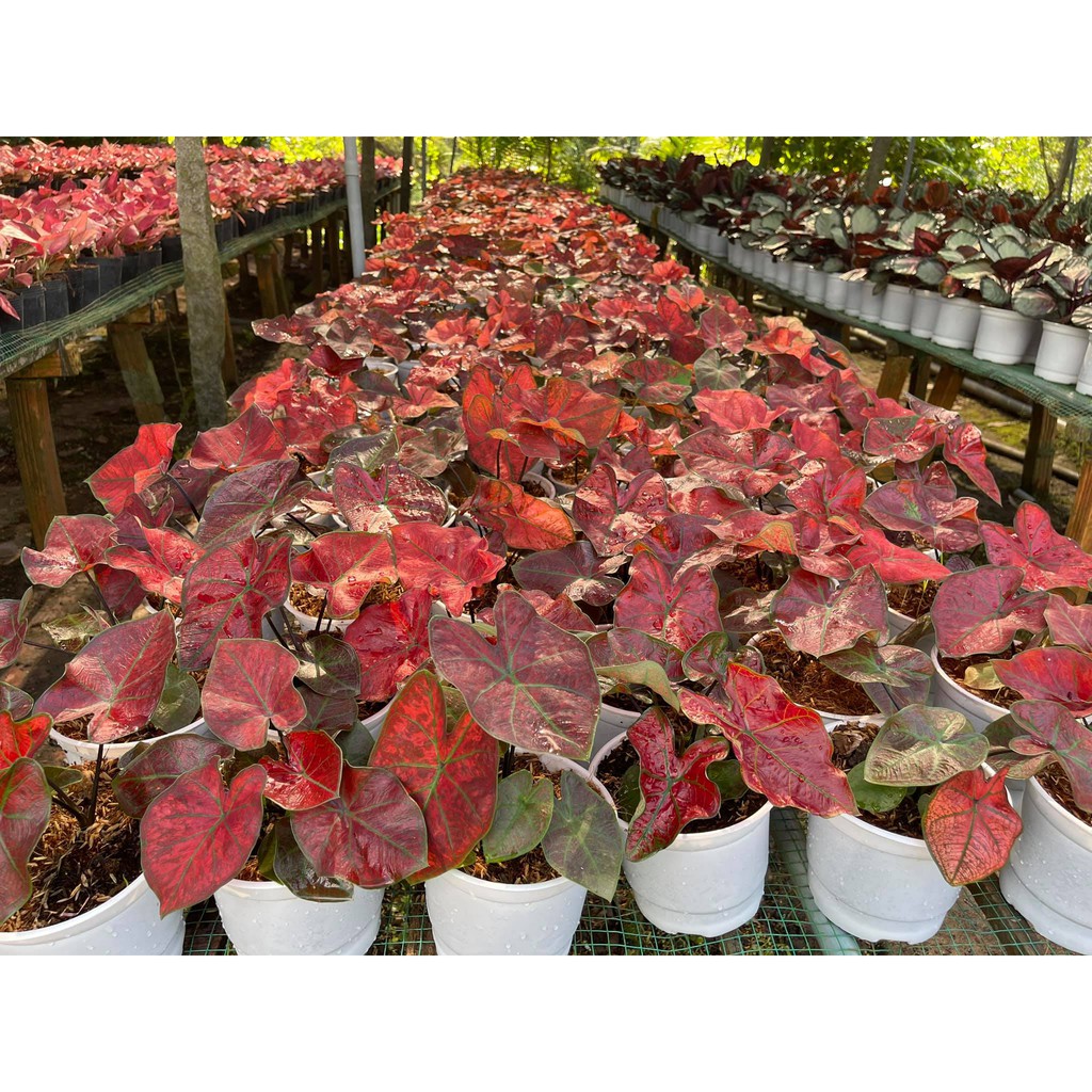 Điểm nổi bật nhất ở cây môn này là hình dáng lá độc đáo. Với những chiếc lá hình tim, nổi bật lên bề mặt lá là những đường gân và lá có màu đỏ rực rỡ, độc đáo.