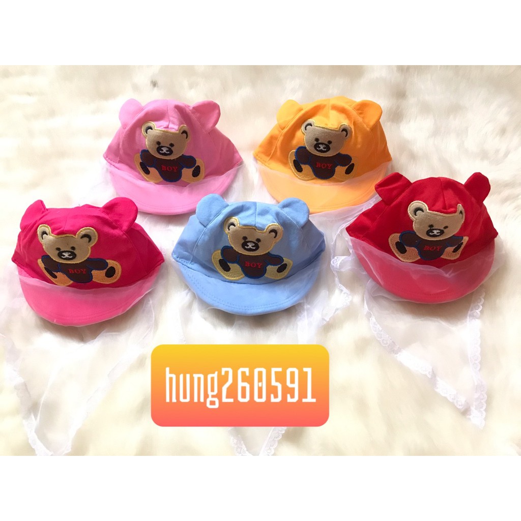 Mũ bằng vải cotton, có phần chun phía sau để điều chỉnh vừa với đầu bé, nhiều màu, họa tiết đáng yeu. Phần khăn voan được may chắc chắn, gọn gàng, vừa vặn để che chăn gió cho bé khi đi ra ngoài. dùng cho bé sơ sinh đên 12 tháng