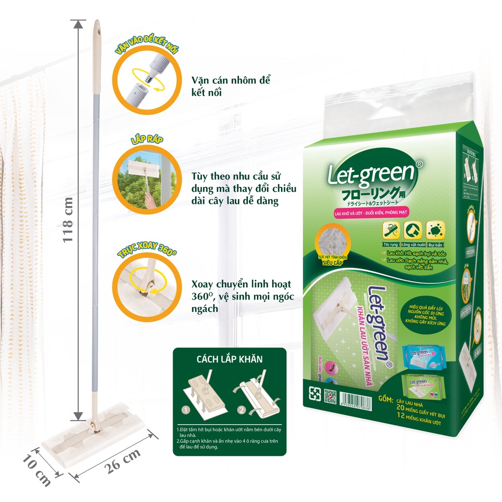 - Bộ cây lau nhà gồm: 01 cây lau khô & ướt, 01 bao Giấy Hít Bụi Let-Green 20 miếng, 01 bao Khăn Lau Ướt Sàn Nhà Let-Green 12 miếng, 02 bao Giấy Đa Năng Let-Green 130 tờ (hàng khuyến mãi tặng kèm)