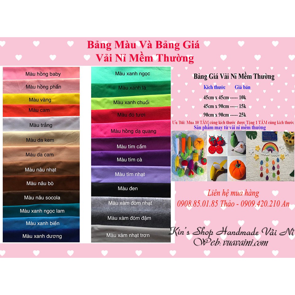 Vải nỉ mềm thường chất liệu như nỉ cứng nhưng mềm và dễ may, êm góc nên thích hợp làm đồ handmade, đồ chơi, rau củ quả, con thú có thước trên 10cm, giúp bé vừa học vừa chơi.::: Kích Thước: