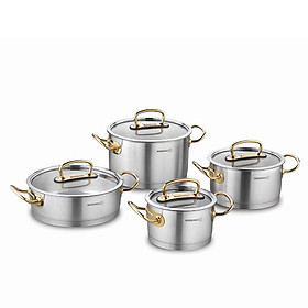 Đến nơi bánMua Bộ 4 nồi inox 18/10 Korkmaz Proline tay nắm màu vàng đồng (nồi 2 lít/3.8 lít/6.3 lít/nồi thấp 3.1 lít)