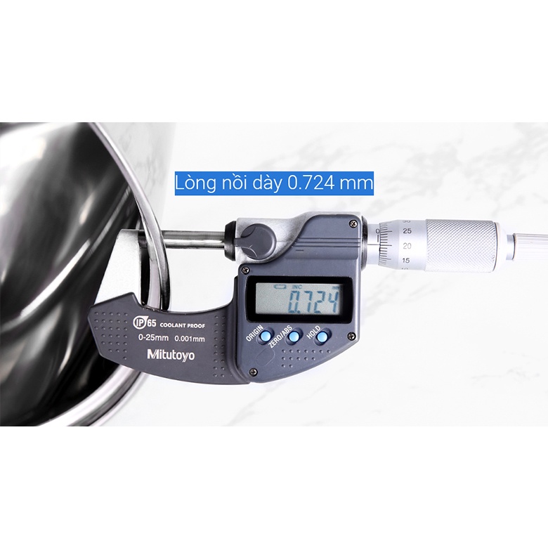 Đáy nồi được cấu tạo từ 5 lớp gồm 1 lớp inox cao cấp, 2 lớp nhôm nguyên chất, 1 lớp kim ngoại và 1 lớp inox 430 giúp truyền nhiệt nhanh, giữ nhiệt tốt và tiết kiệm năng lượng.