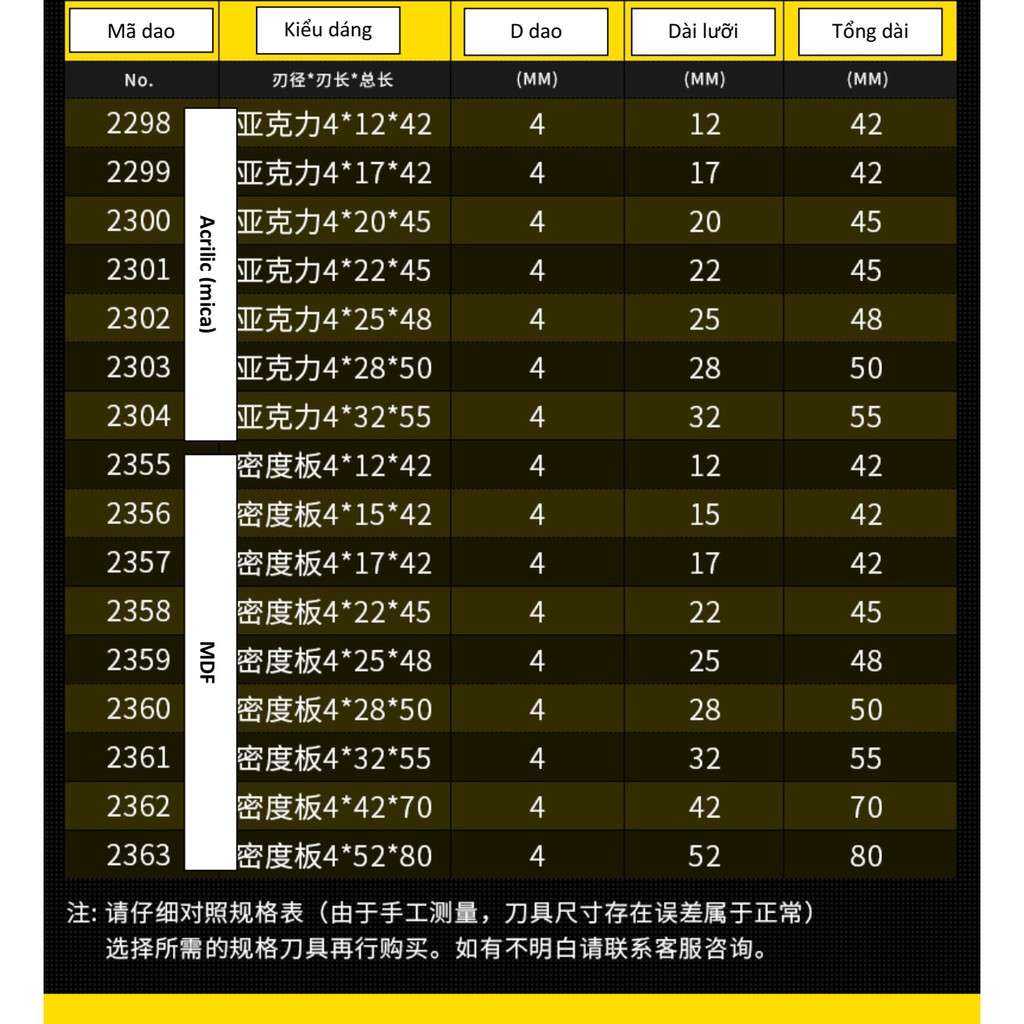 Nhà cửa & Đời sống > Dụng cụ & Thiết bị tiện ích > Dụng cụ > Khác || Mũi dao cắt CNC MDF thân 4.0mm, xoắn 1 lưỡi, HuhaoCòn hàng