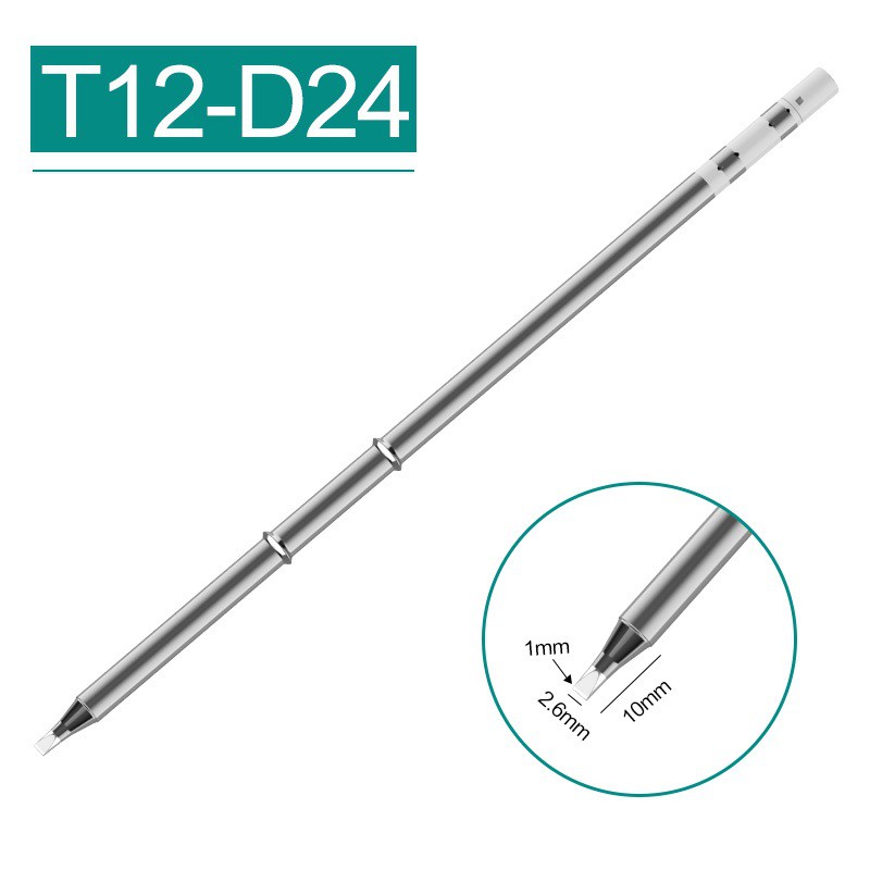 Mũi hàn T12-D24 kiểu dẹt cho các máy hàn T12 phổ biến kiểu Hakko, Quicko, T12-DMã T12-D24 phù hợp với hàn linh kiện điện tử, thiết bị điện, sử dụng mũi này don keo ic trong sửa chữa điện thoại cũng ok hơn loại mũi đầu nhọn bé