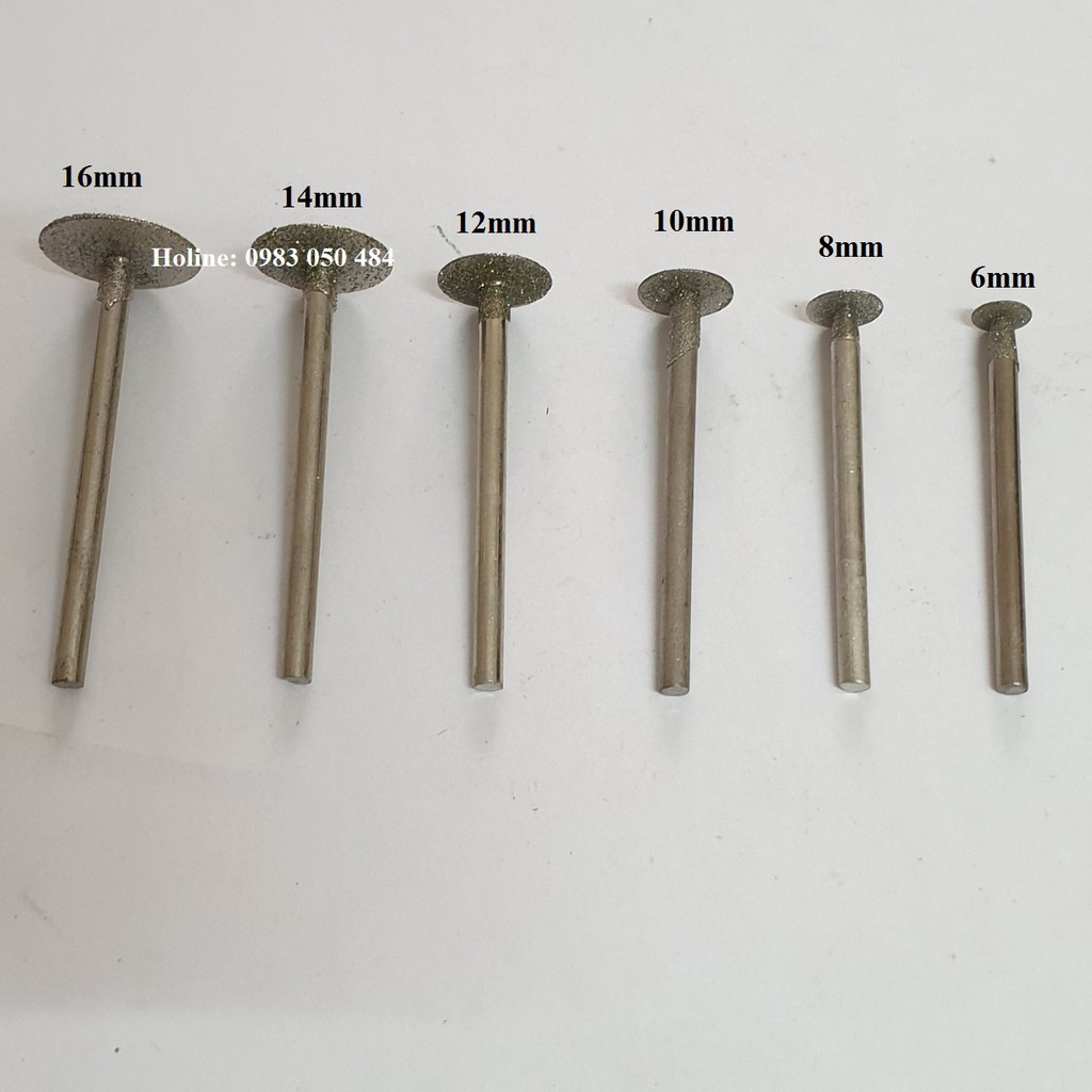 chân cán 3mm đầu khắc có kích thước là: 6mm,8mm, 10mm, 12mm, 14mm, 16mm giá bán 1 mũi các bạn nhớ chọn kích thước phù hợp với gia côngứng dụng nhiều nhất trong ngành nghề đá, ngọc, thủy tinh và 1 số nganh khác như mài nhôm đồng....