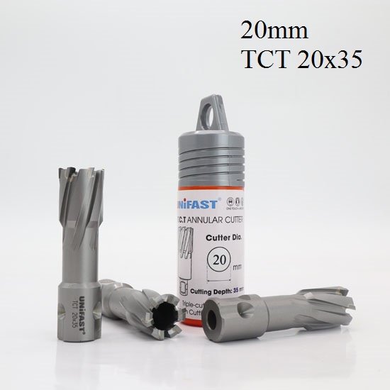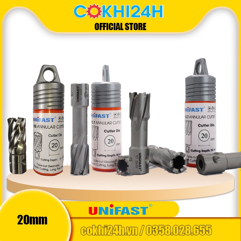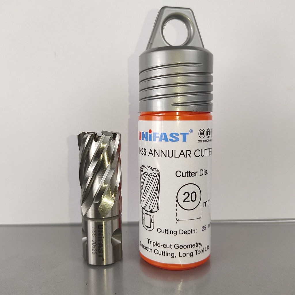Mũi khoan từ rút lõi phi 20mm Unifast HSS 20x25 / TCT 20x35 / TCT 20x50 là dòng mũi cao cấp sản xuất theo tiêu chuẩn công nghệ của Nhật Bản. Mũi tạo ra đường kính lỗ 20mm, độ sâu khoét tối đa gồm các chuẩn 25mm, 35mm, 50mm, 75mm, 100mm.------------------------------------