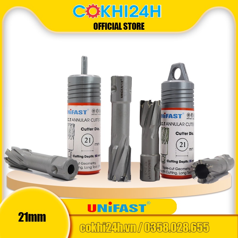 Mũi khoan từ rút lõi phi 21mm Unifast HSS 21x25 / TCT 21x35 / TCT 21x50 là dòng mũi cao cấp sản xuất theo tiêu chuẩn công nghệ của Nhật Bản. Mũi tạo ra đường kính lỗ 21mm, độ sâu khoét tối đa gồm các chuẩn 25mm, 35mm, 50mm, 75mm, 100mm.------------------------------------