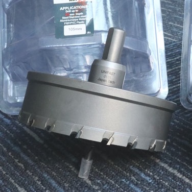 - Mũi khoét Unifast phi 105 có trang bị thêm một mũi khoan tâm 6mm giúp định vị chính xác lỗ khoan.