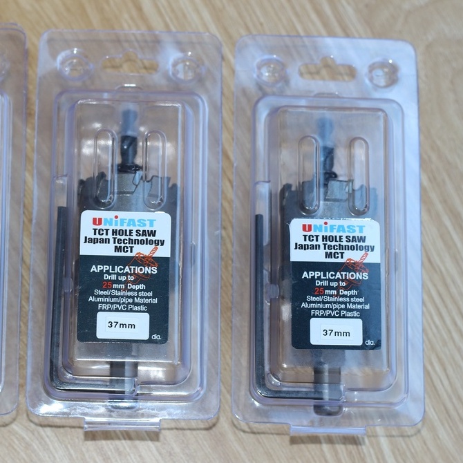 - Mũi khoét Unifast phi 37 có trang bị thêm một mũi khoan tâm 6mm giúp định vị chính xác lỗ khoan.