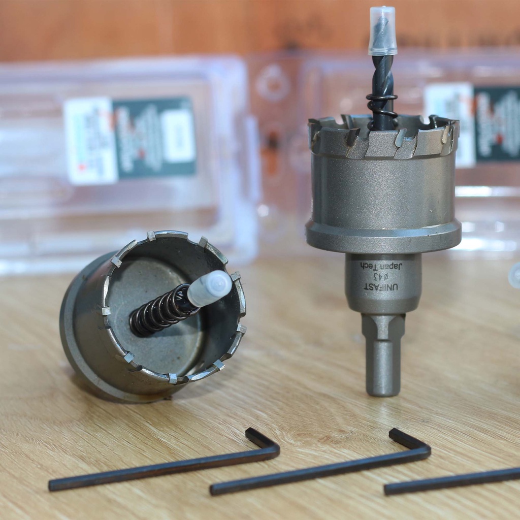 - Mũi khoét Unifast phi 43 có trang bị thêm một mũi khoan tâm 6mm giúp định vị chính xác lỗ khoan.