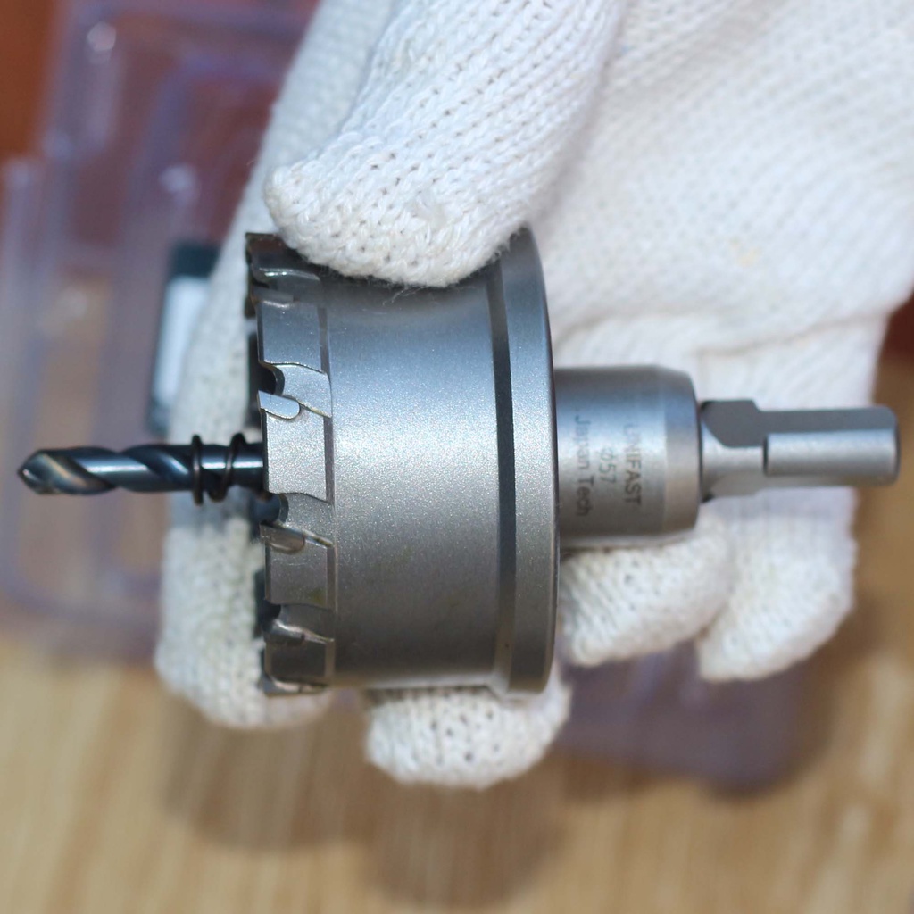 - Mũi khoét Unifast phi 57 có trang bị thêm một mũi khoan tâm 6mm giúp định vị chính xác lỗ khoan.