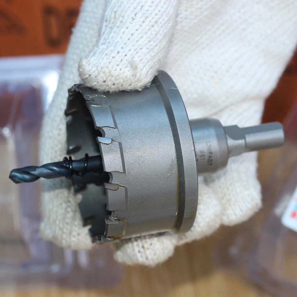- Mũi khoét Unifast phi 61 có trang bị thêm một mũi khoan tâm 6mm giúp định vị chính xác lỗ khoan.
