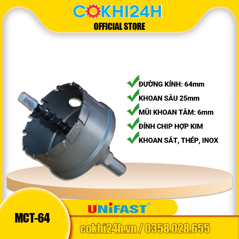 - Mũi khoét 64mm Unifast MCT-64 có đường kính lưỡi 64mm, khoan sâu được tối đa 25mm.