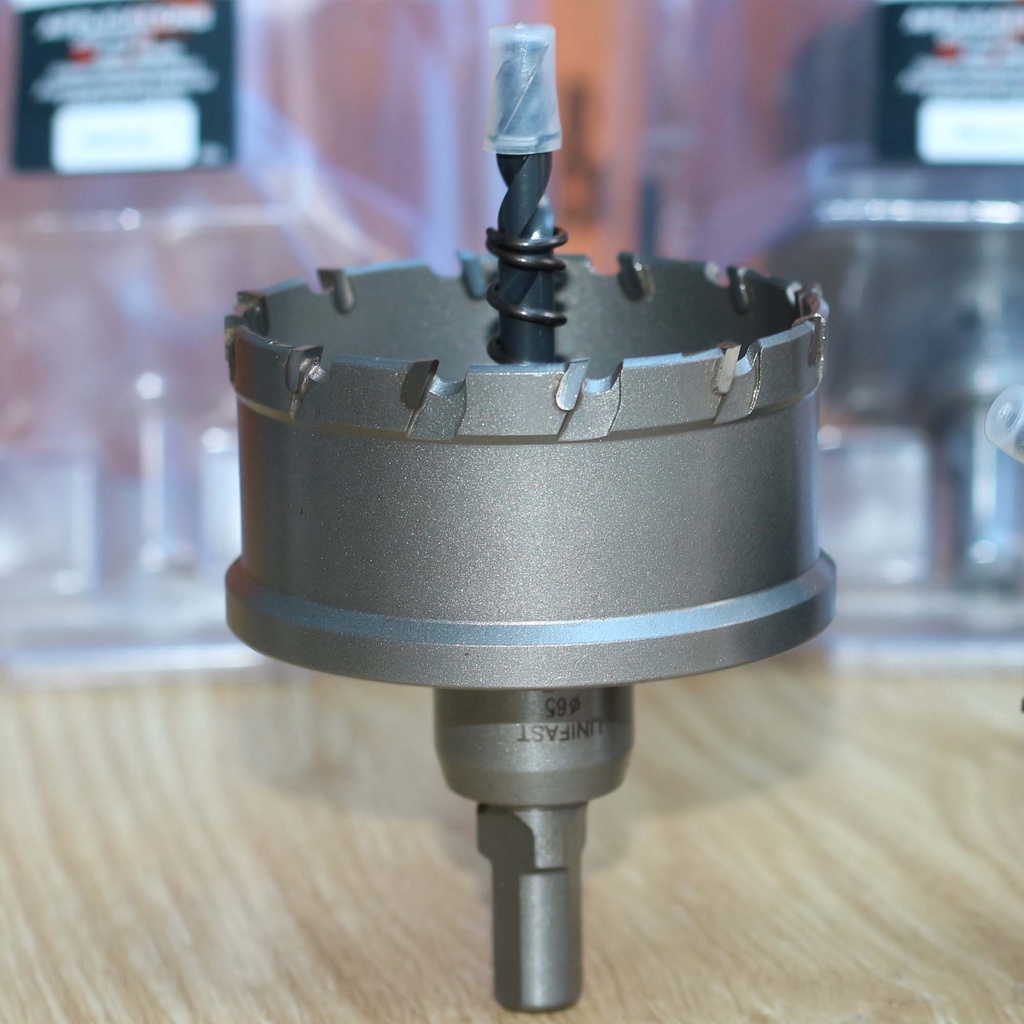 - Mũi khoét Unifast phi 65 có trang bị thêm một mũi khoan tâm 6mm giúp định vị chính xác lỗ khoan.