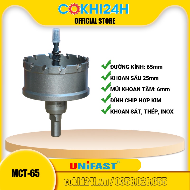 Mũi khoét 65mm Unifast MCT-65 lưỡi hợp kim [ Phi 65 ] còn gọi là mũi lả lỗ, mũi cưa lỗ (hole saw cutter). Là loại mũi khoan khoét rút lõi răng hợp kim siêu cứng. Được sử dụng khá phổ biến trong sản xuất công nghiệp cũng như dân dụng.Mũi khoét kim loại Unifast thường là lựa chọn tốt nhất c. Ho các nhu cầu khoan cắt lỗ đường kính lớn trên vật liệu mỏng. Như khoan trên ống, khoan tủ điện, cửa, hộp...