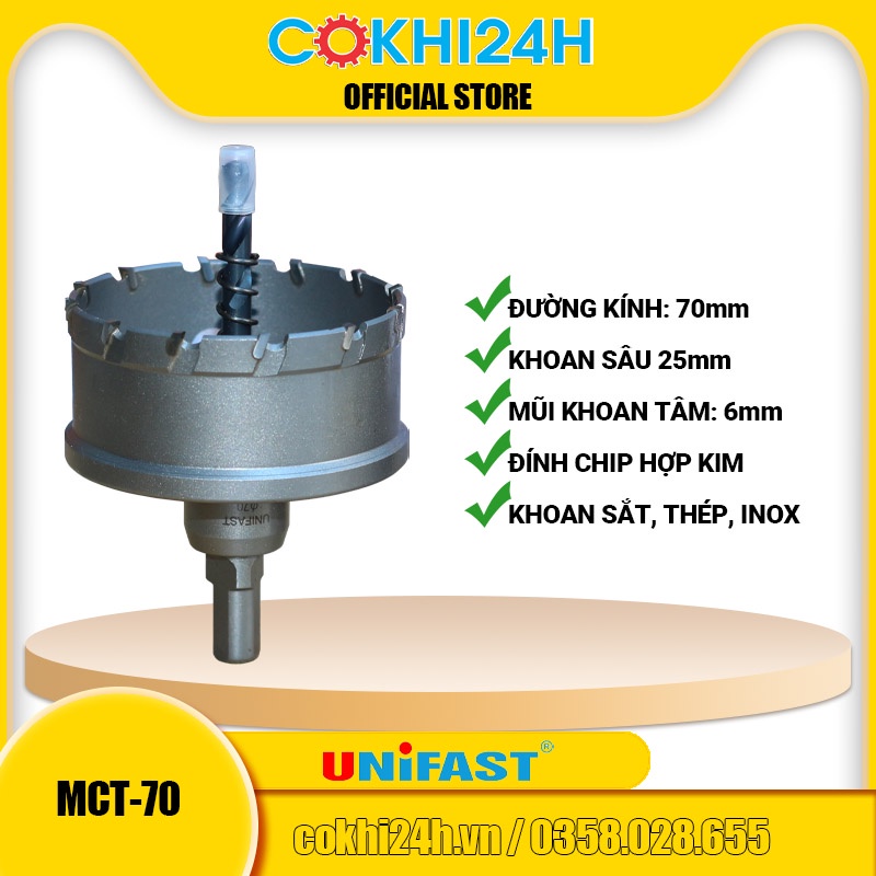 - Mũi khoét 70mm Unifast MCT-70 có đường kính lưỡi 70mm, khoan sâu được tối đa 25mm.
