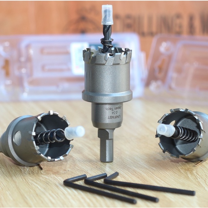 - Mũi khoét Unifast phi 34 có trang bị thêm một mũi khoan tâm 6mm giúp định vị chính xác lỗ khoan.
