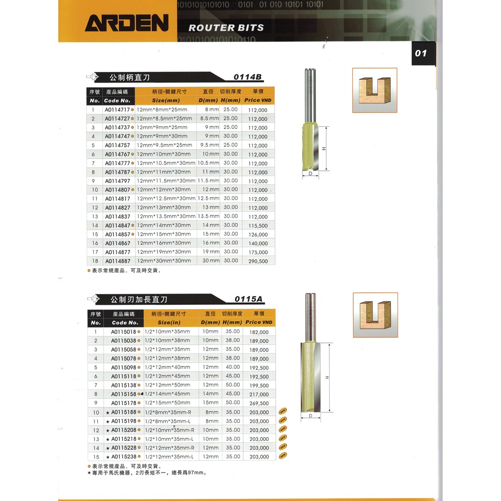 Nhà cửa & Đời sống > Dụng cụ & Thiết bị tiện ích > Dụng cụ > Cưa, máy cắt & máy mài || Mũi phay gỗ thẳng ARDEN dòng A0114Còn hàng