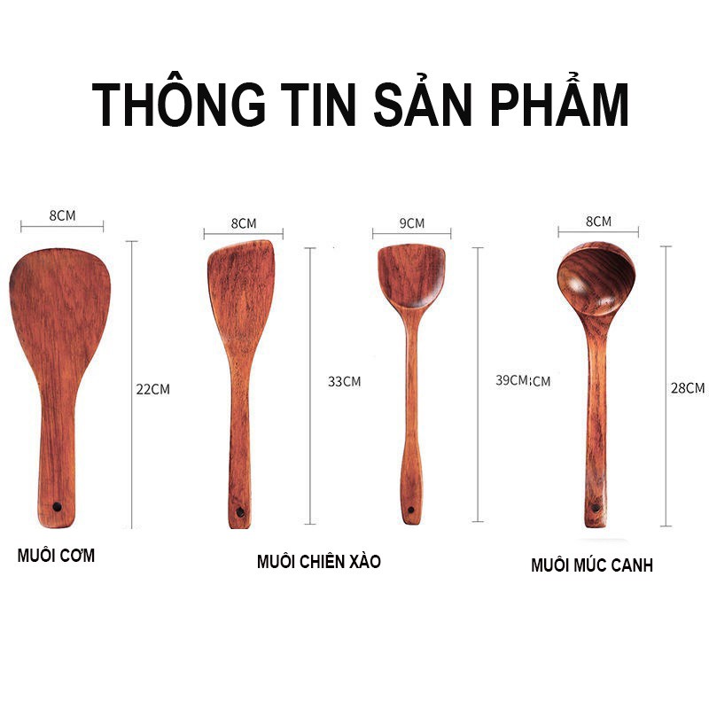 - Kích thước: Muôi rãnh 30x7cm, vá xới cơm 22x7cm, xạn xào 30x7cm