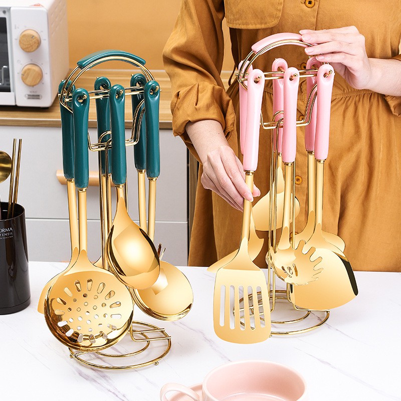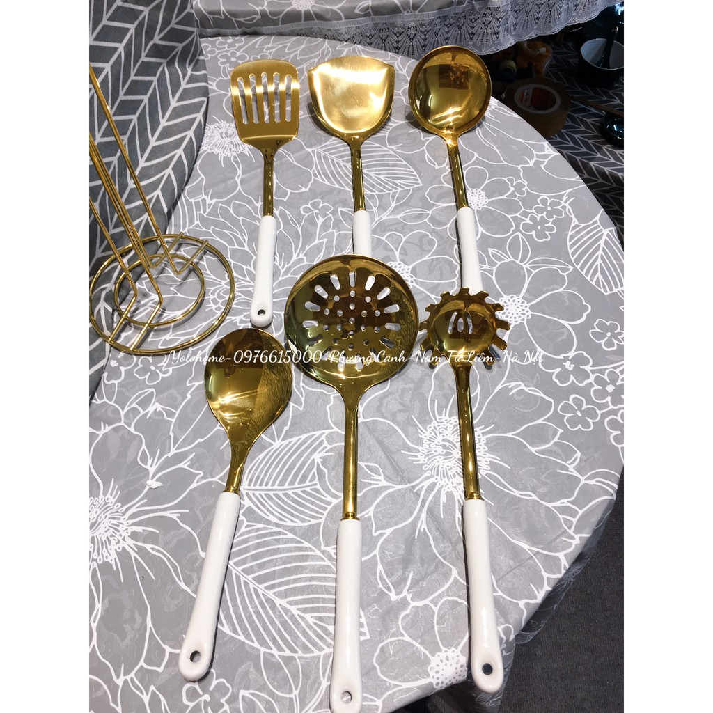 Nhà cửa & Đời sống > Bộ đồ bàn ăn > Bộ dao kéo || Bộ muôi nấu ăn ❣️𝗞𝗛𝗢̂𝗡𝗚 𝗚𝗜̉ 𝗦𝗘́𝗧❣️ bộ muôi 6 món có giá treo và cán sứ tiện lợiCòn hàng
