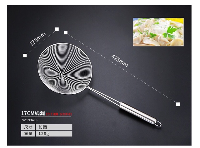 Muôi vớt rau củ, đồ chiên chất liệu inoxKích thước: 14cm, 16cm, 18cm, 20cm chiều rộng vợt