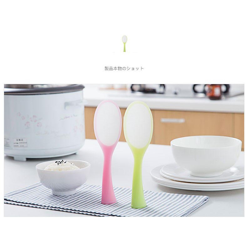 Công dụng: Bề mặt chống dính tuyệt hảo. Có thể đặt muôi cơm tự đứng vững được trên bàn ăn, giúp muôi cơm luôn sạch sẽ. Màu sắc: Hồng nhạt và Xanh lá cây