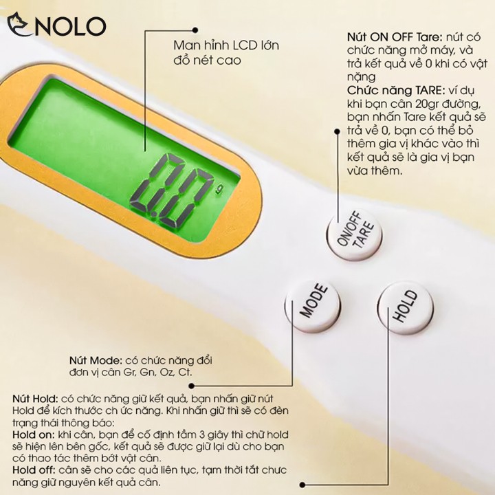 Muỗng hỗ trợ 4 đơn vị đo lường tiêu chuẩn là Gr, Gn, Oz, Ct bạn có thể chuyển đổi dễ dàng qua nút Mode trên thân muỗng.