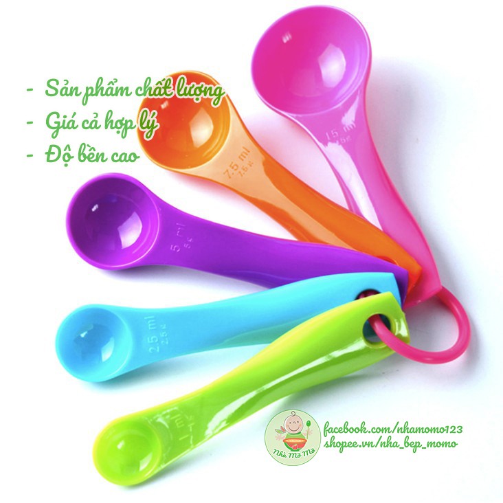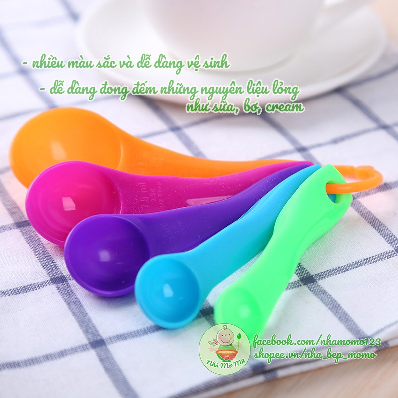 - Bộ thìa đong 5 chiếc được làm từ nhựa với nhiều màu sắc và dễ dàng vệ sinh.