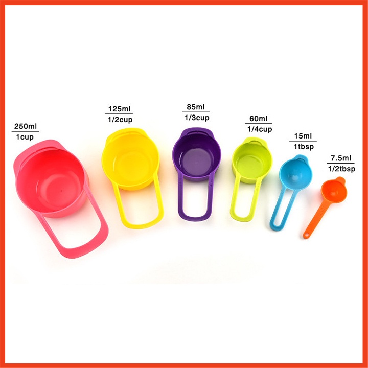 Bộ 6 muỗng đo lường đủ màuGồm: 1/2 tbsb + 1 tbsp + 1/4 cup + 1/3 cup + 1/2 cup + 1 cup