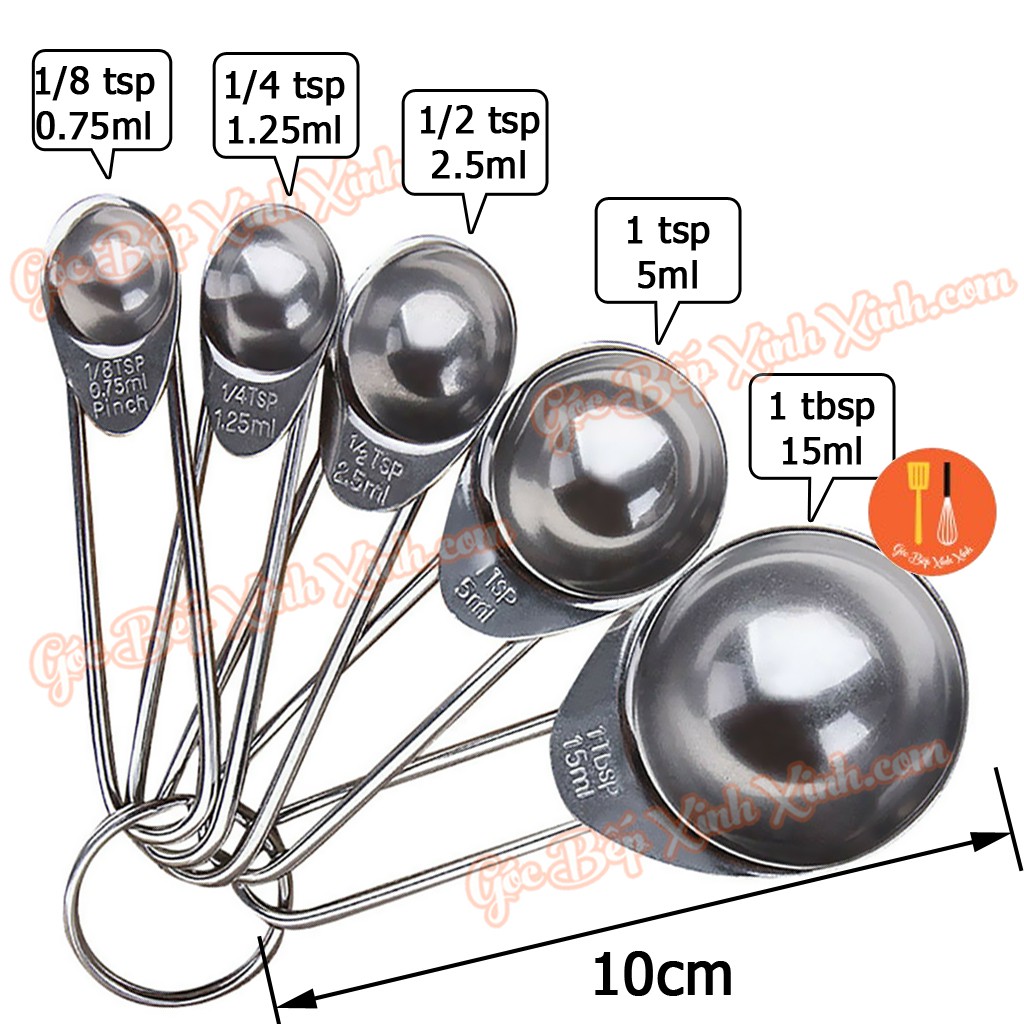 Bộ gồm 5 muỗng đong inox thép không gỉ với các định lượng :1 tbsp = 15ml
