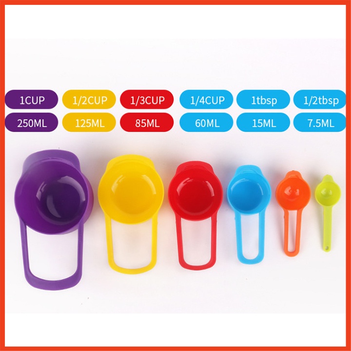 Bộ 6 muỗng đo lường đủ màuGồm: 1/2 tbsb + 1 tbsp + 1/4 cup + 1/3 cup + 1/2 cup + 1 cup