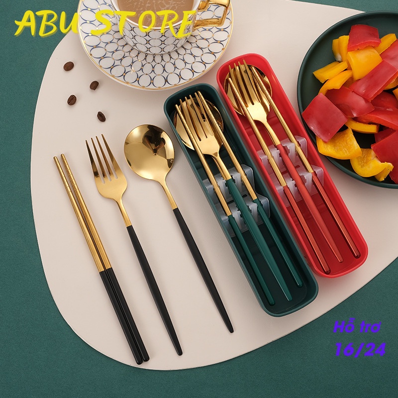 Bộ muỗng đũa Dĩa thìa inox 304 mạ vàng sang chảnh cao cấp Dụng cụ cá nhân ăn cơm văn phòng dã ngoại ABUSTORE D24