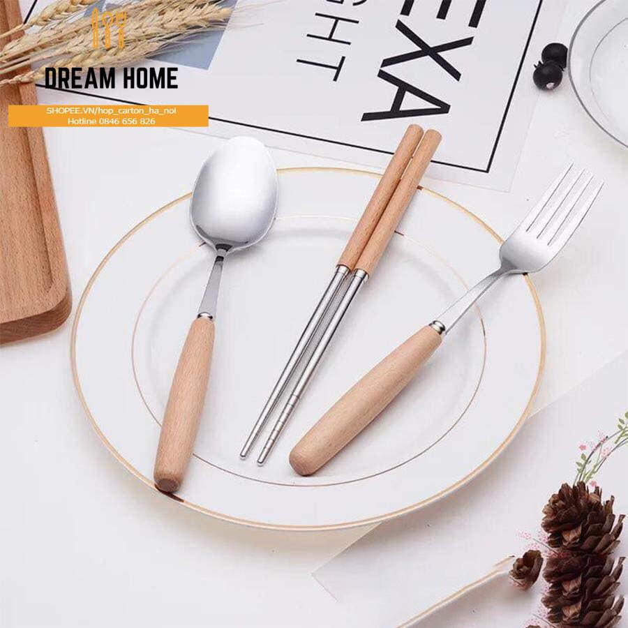 - Bộ Thìa Đũa Dĩa inox cán gỗ sồi kèm hộp