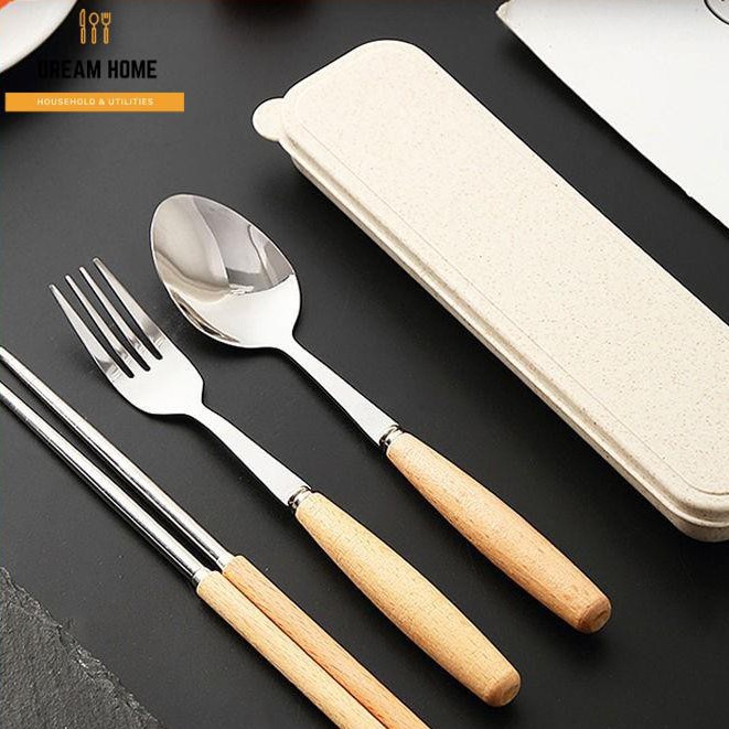☘️ Bộ thìa - dĩa - đũa inox kết hợp cán gỗ , hộp đựng bằng nhựa lúa mạch sang - xịn