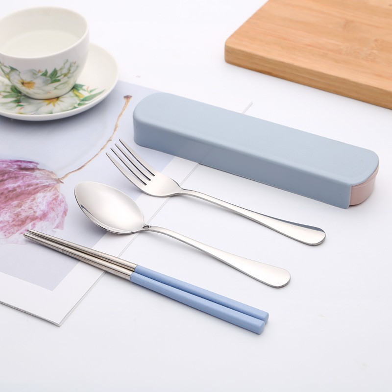 Bộ Muỗng Đũa Nĩa Bằng Thép Không Gỉ Tiện Lợi Du Lịch / Văn Phòng+Kèm Hộp Đựng Bằng Lúa Mạch.