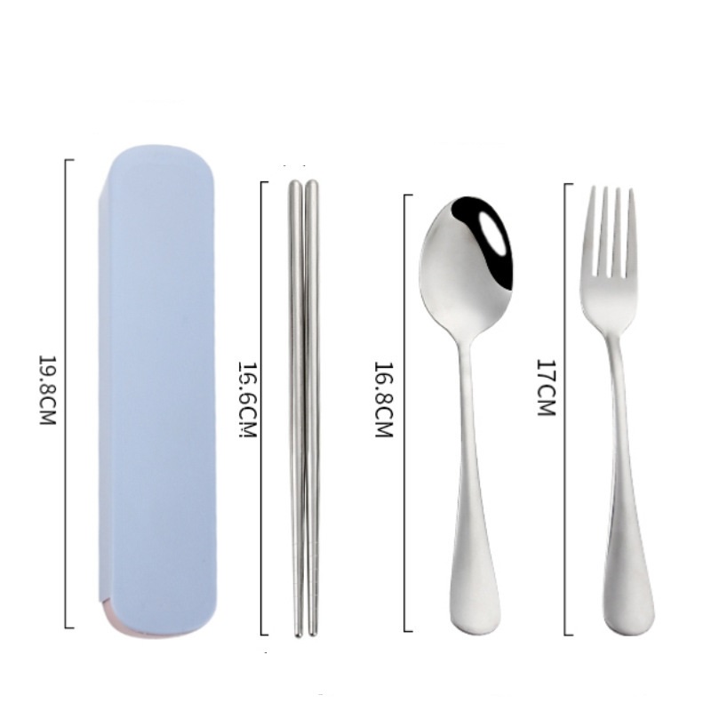 - Chất liệu: bộ đồ ăn inox với hộp đựng bằng nhựa với các chi tiết:
