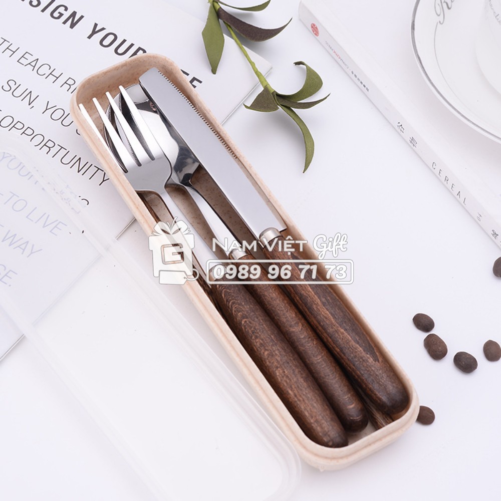 Bộ Muỗng Đũa Nĩa Dao Cán Gỗ Inox410 - Mẫu mới 2021Sản phẩm nhận được gồm 1 dao, 1 đũa, 1 muỗng, 1 nĩa và 1 hộp nhựa lúa mì
