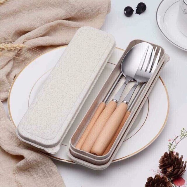 - Bộ gồm đũa, thìa và dĩa inox rất đẹp cán gỗ sồi, đựng trong 1 hộp nhựa lúa mạch sang trọng. Dùng mang cơm đi làm, mang đi du lịch hay picnic tiện lợi.