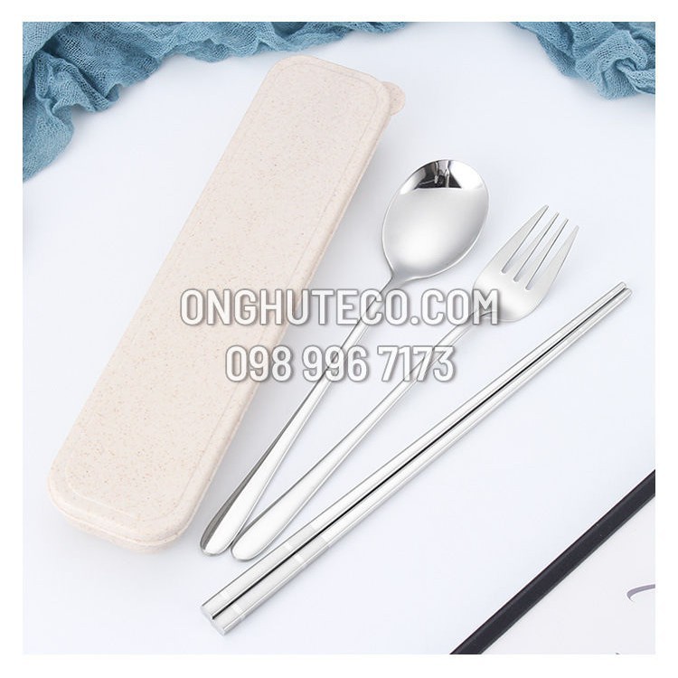 Bộ Muỗng Đũa Nĩa Văn Phòng Inox 304 Loại 1 Cao Cấp, Kèm Hộp Nhựa Sinh Học Lúa Mì, Tặng Túi Vải