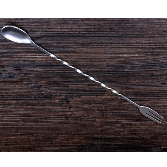 Một đầu có dạng thìa dùng để khuấy cocktail, một đầu có thanh nhọn dùng để ghim trái cây.