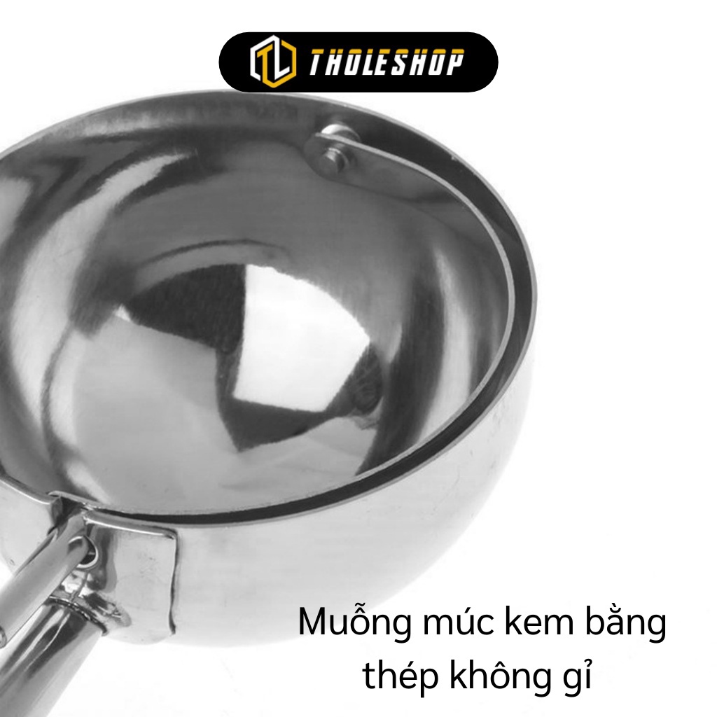 - Muỗng múc kem thép không gỉ 5cm là một công cụ được thiết kế tay cầm vừa vặn và nút gạt kem tiện lợi để bạn có thể dễ dàng múc và nhả những viên kem lạnh ngon miệng thật đẹp mắt, hỗ trợ các bà nội trợ trong việc trang trí món tráng miệng cho các thành viên trong gia đình.