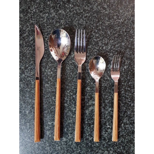Nhà cửa & Đời sống > Dụng cụ nhà bếp > Cây vét bột & đồ gắp thức ăn || muỗng + nĩa + dao inox tay cầm nhựa giả vân gỗ cao cấpCòn hàng