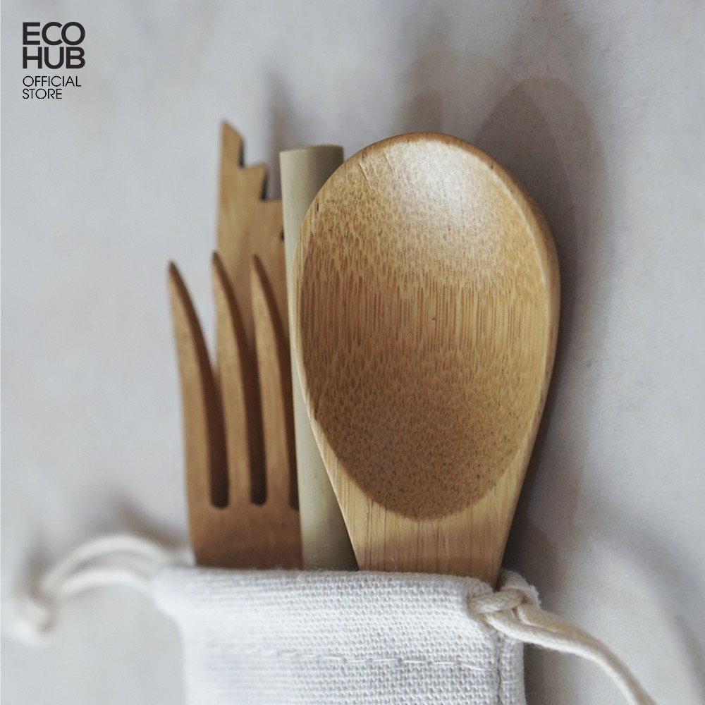 - Bộ sản phẩm bao gồm: Dao, Nĩa, Muỗng, Ống hút tre, Cọ cước, Túi vải (6 món)