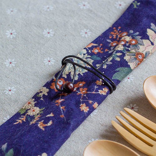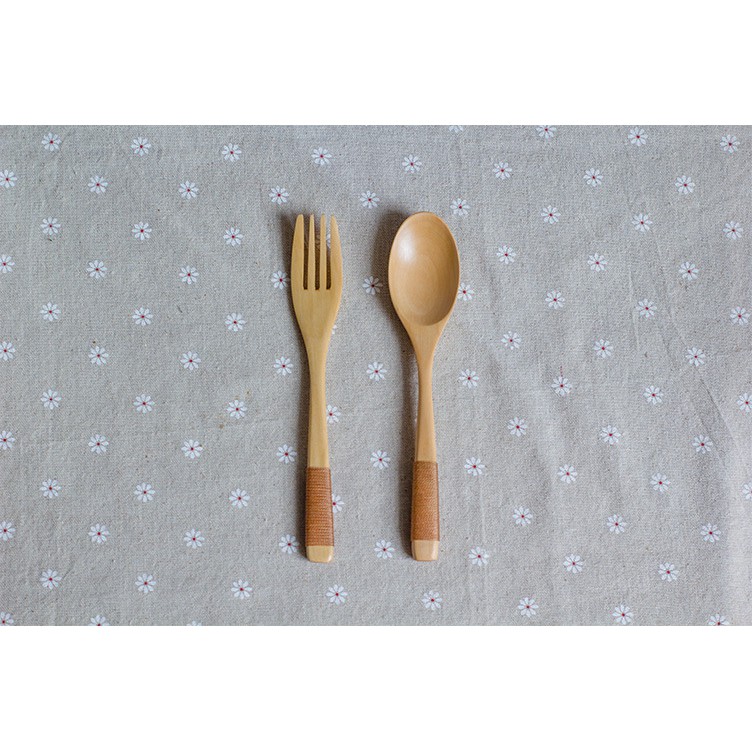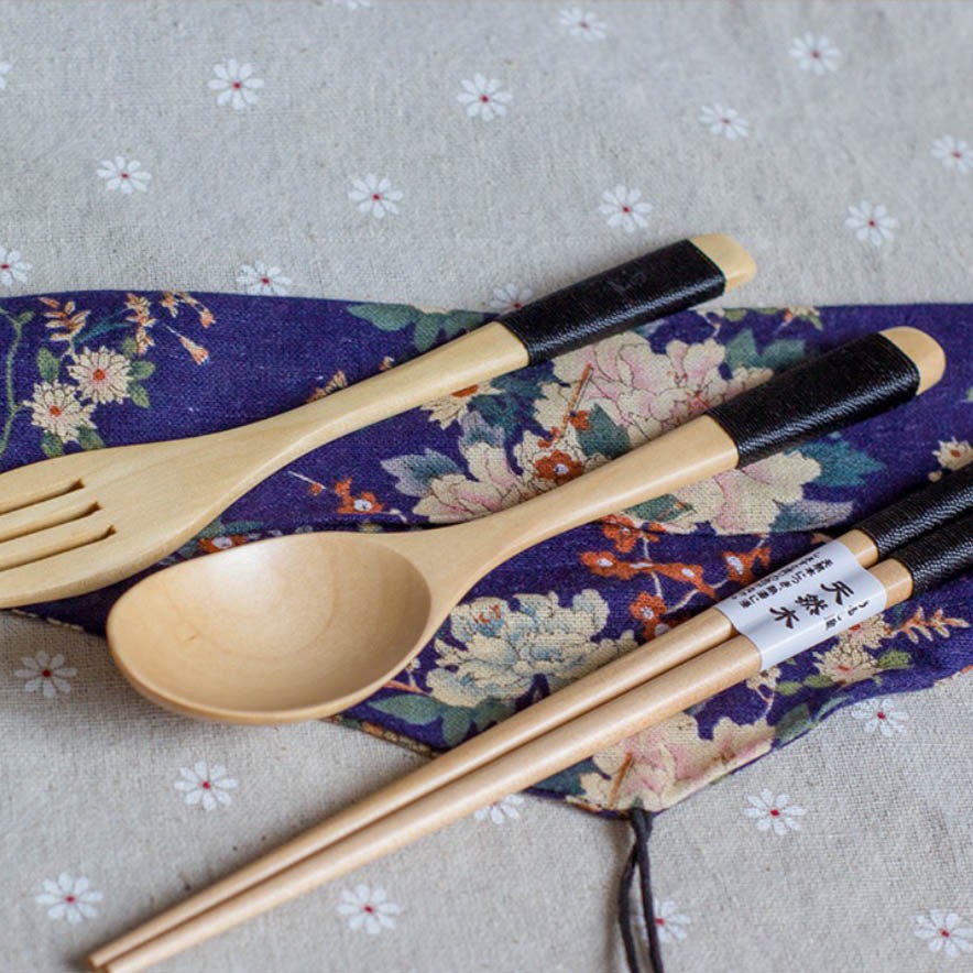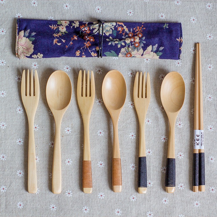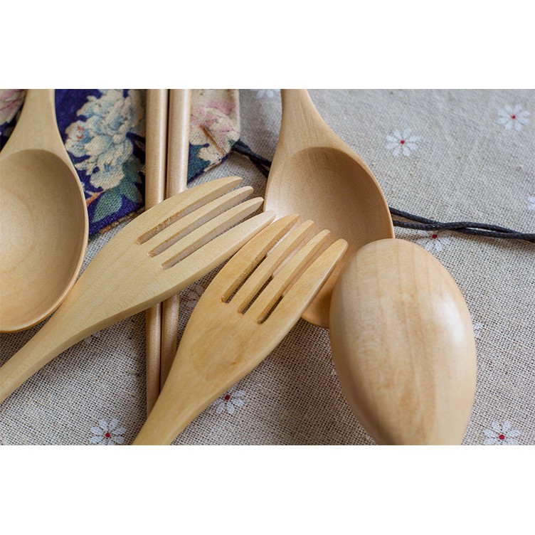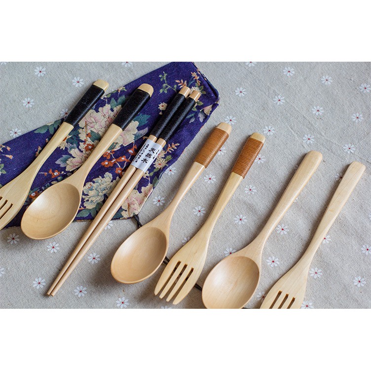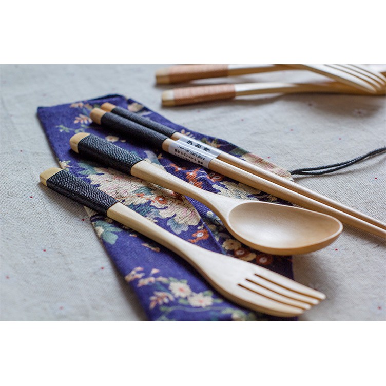 Muỗng nĩa đũa gỗ trang trí phong cách Nhật - Tông vàng, có túi vải đẹp