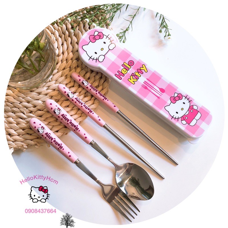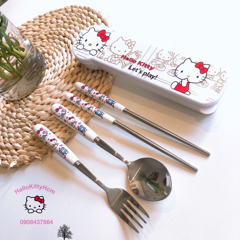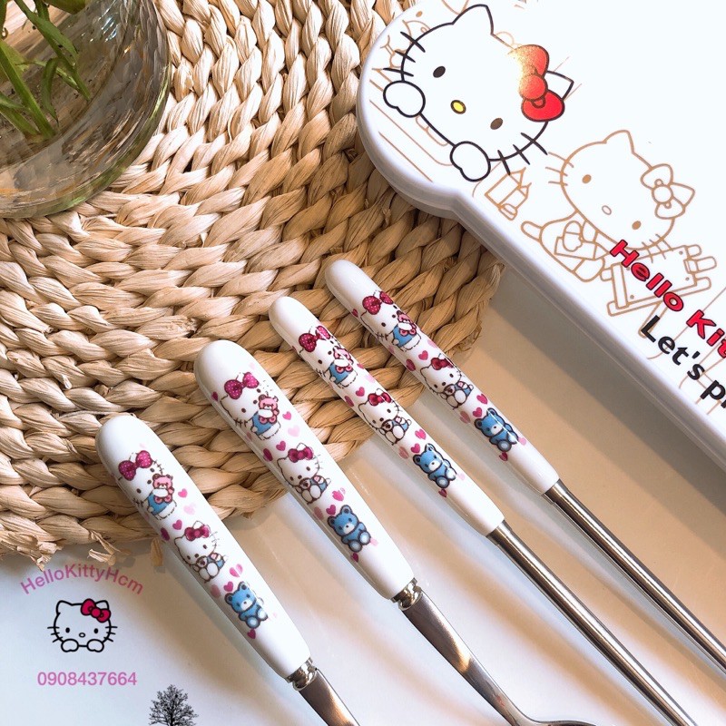 Bộ muỗng nĩa inox cán sứ có hộp HelloKitty