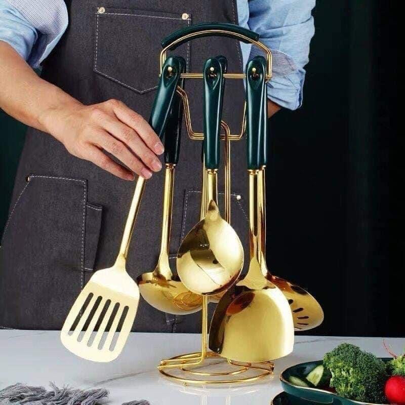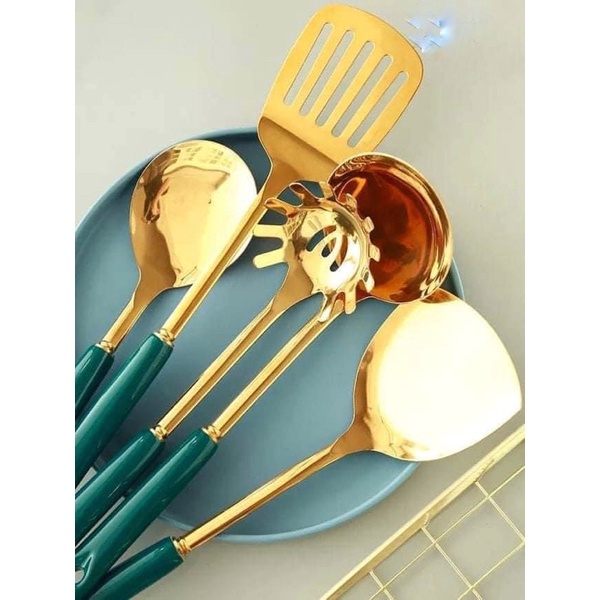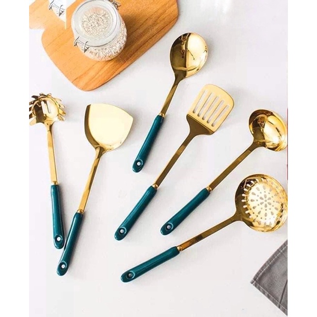 Bộ gồm 6 món: muỗng canh sâu lòng, muỗng canh nông, muỗng vớt, xẻng đặc, xẻng thủng, đánh trứng,bột.Bộ gồm giá treo, chất liệu inox, kích thước giá cao 40cm, mỗi môi/ thìa dài khoảng 32cm, cán sứ xanh ngọc sang trọng