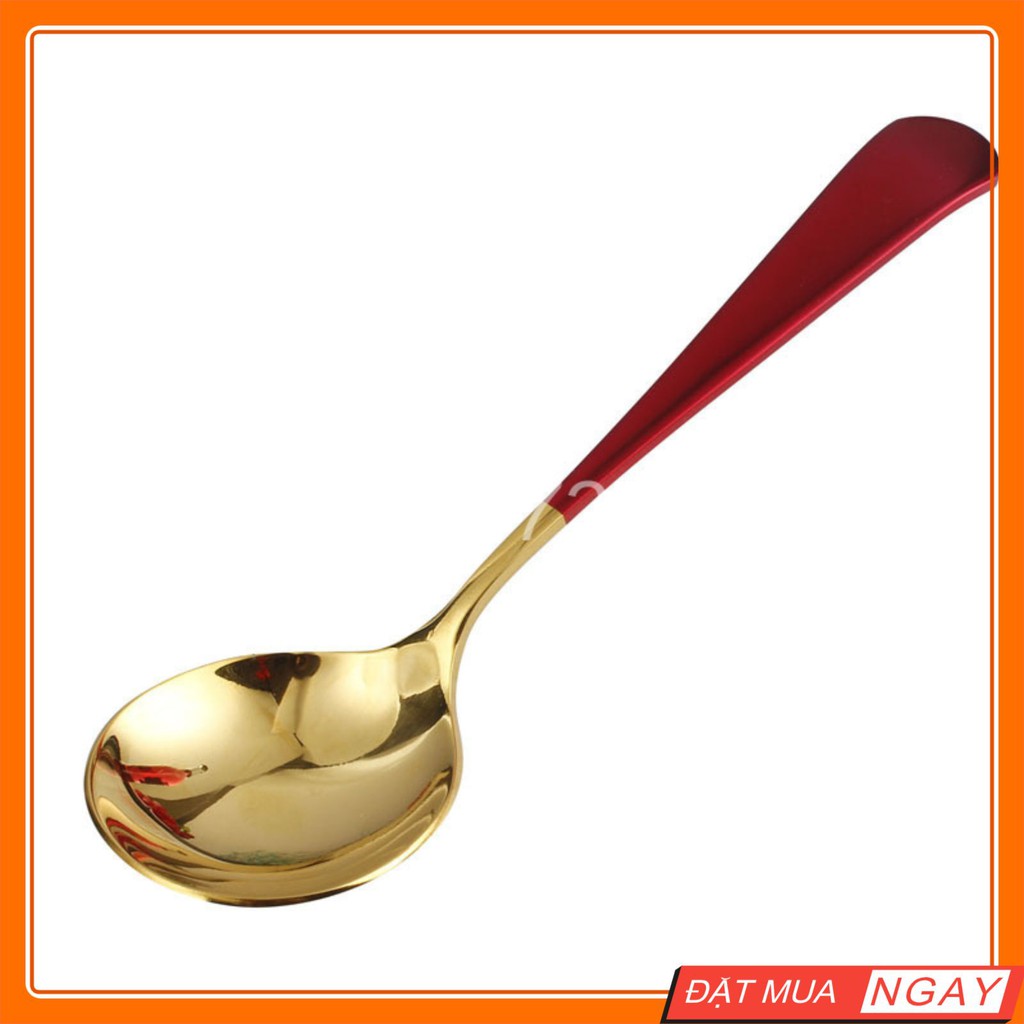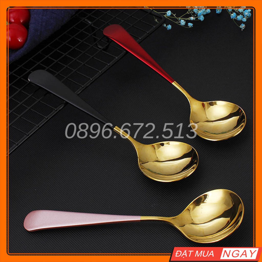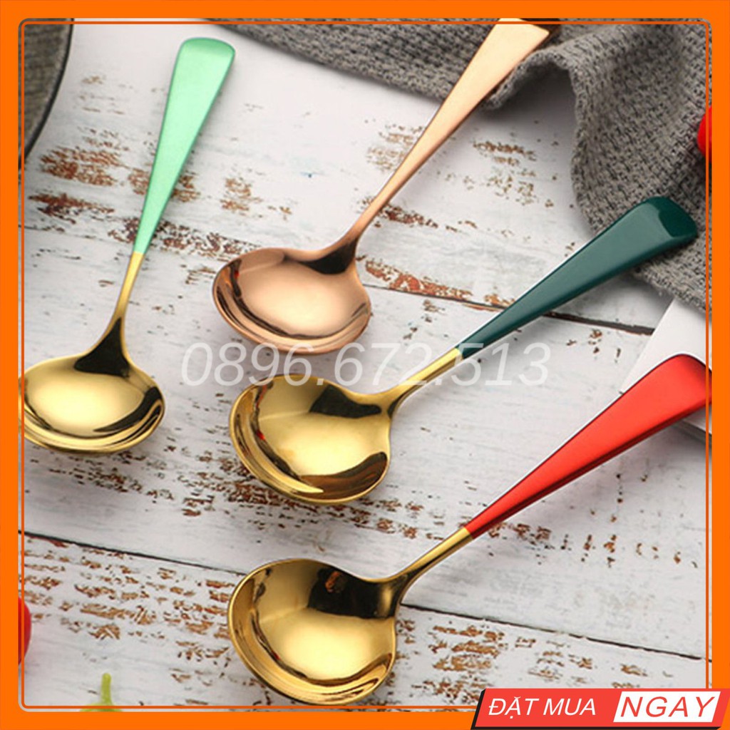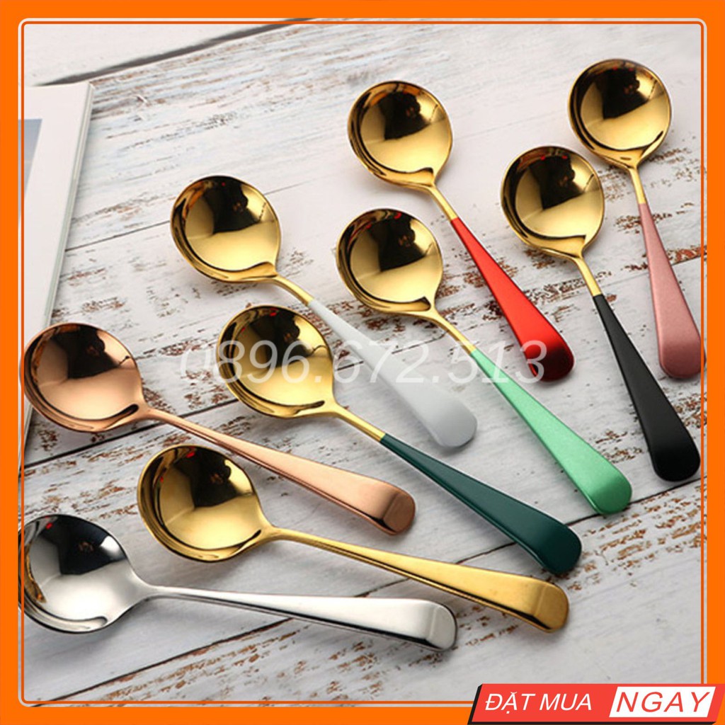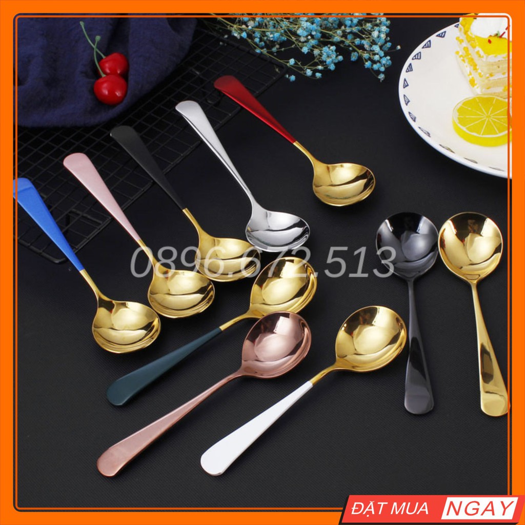 ✔️ Thìa Inox Mạ Vàng Cán Dài Nhiều Màu Với thiết kế tròn, rộng phù hợp khuôn miệng, dễ dàng xúc cơm, soup, cháo...