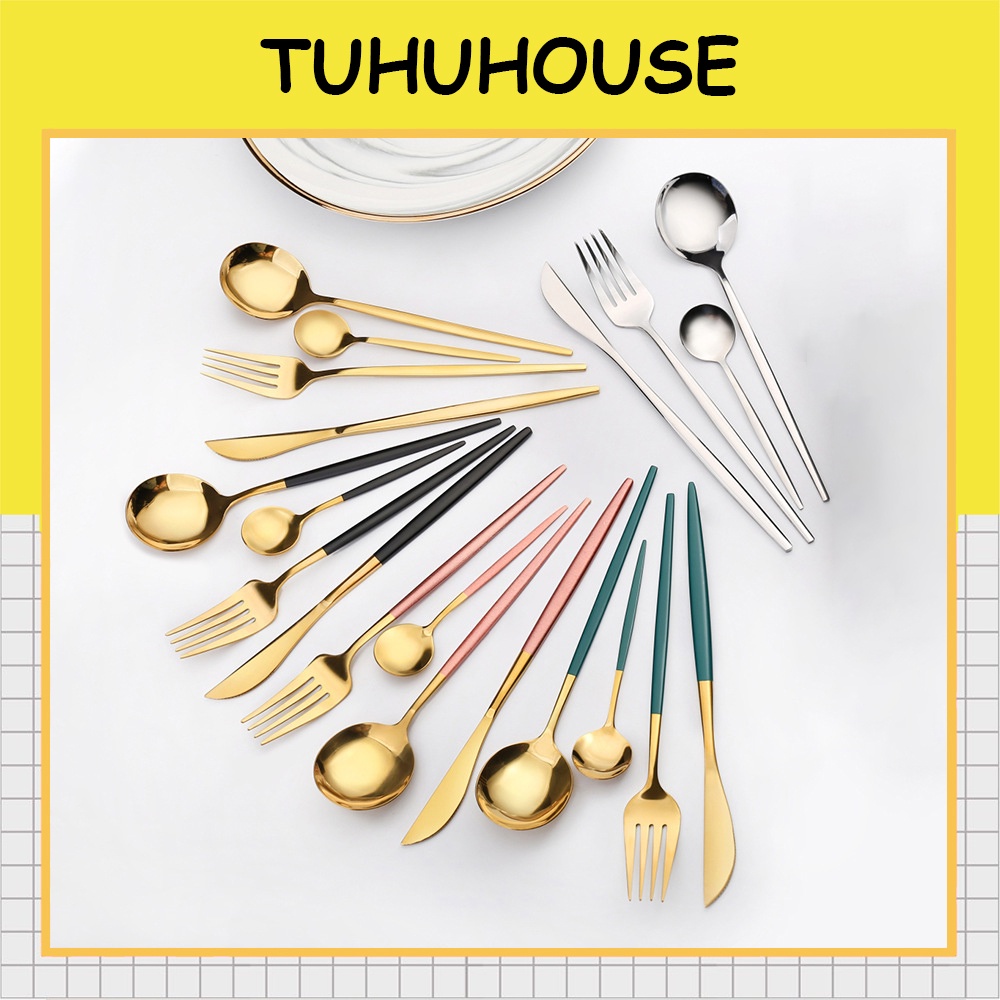 Thìa muỗng nĩa dao inox 304 mạ vàng cán dài nhiều màu sang chảnh hàng cao cấp - Tuhu's House