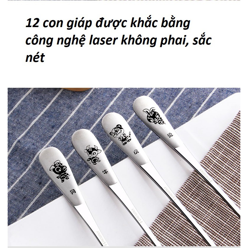 Muỗng tròn dài, muỗng cà phê pha thức uống bằng INox 304 cao cấp khắc 12 con giáp