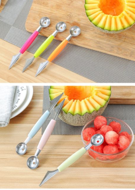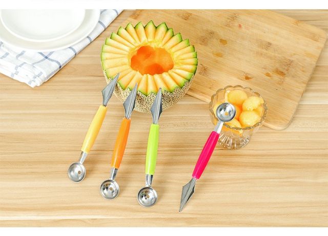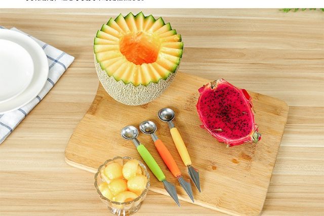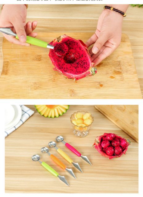 Dao thì khắc tỉa nạo hoa quả 2 đầu đa năng Dụng cụ muỗng tạo hình dưa hấu thanh long trái cây cắt tỉa trang trí-Thành phần: inox, nhựa